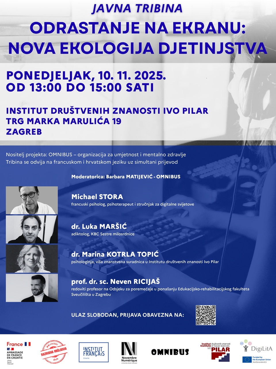 U ponedjeljak, 10. studenoga 2025. od 13 do 15 sati u Institutu društvenih znanosti Ivo Pilar, Trg Marka Marulića 19, Zagreb, održat će se javna tribina “Odrastanje na ekranu: Nova ekologija djetinjstva”, koju organizira OMNIBUS – organizacija za umjetnost i metalno zdravlje, uz podršku Francuskog veleposlanstva u Hrvatskoj, Francuskog instituta u Hrvatskoj, Grada Zagreba, Zaklade Kultura nova i Instituta društvenih znanosti Ivo Pilar.